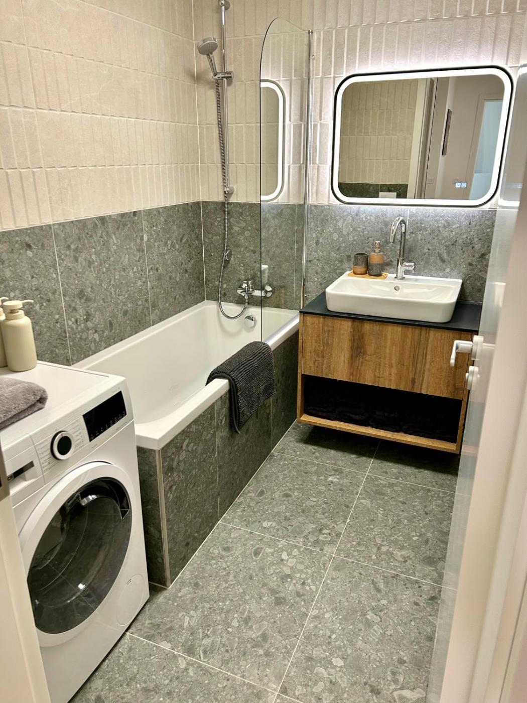 The apartment provides guests with a balcony,courtyard views, a seating area, a flat-screen TV, a fully equipped kitchen with a dishwasher and an oven, and a private bathroom with bath and free toiletries. A microwave, a toaster and fridge are also available, as well as a coffee machine and a kettle. At the apartment complex, each unit has bed linen and towels.